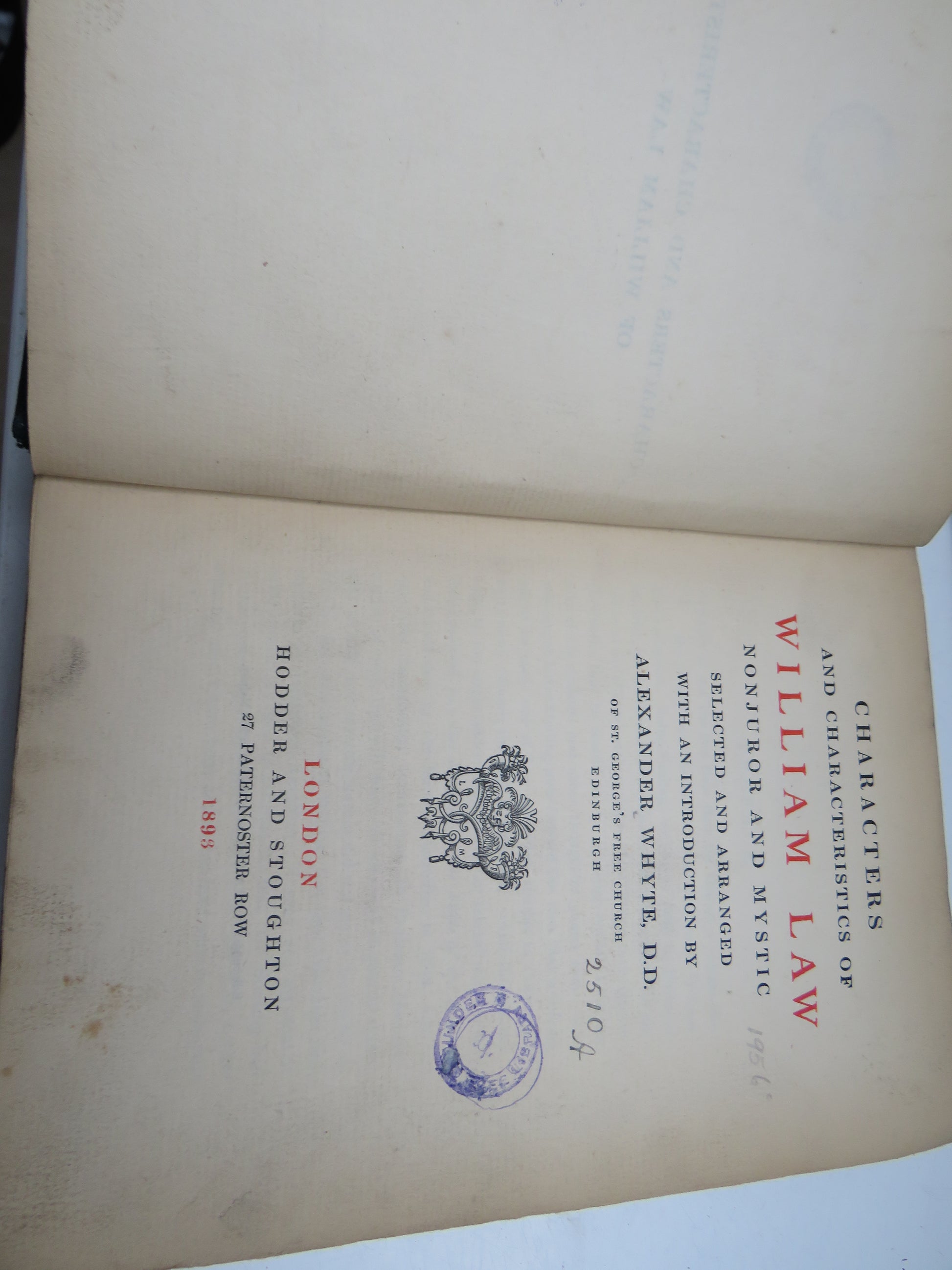 Characters and Characteristics of William Law Nonjuror and Mystic Selected and Arranged With An Introduction By Alexander Whyte 1893