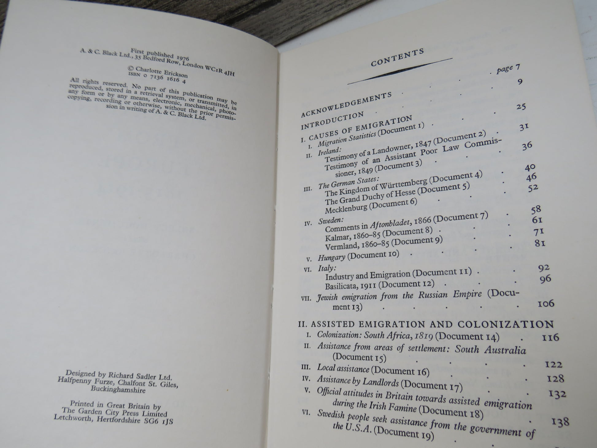 Emigration From Europe 1815-1914 Select Documents Edited By Charlotte Erickson 1976